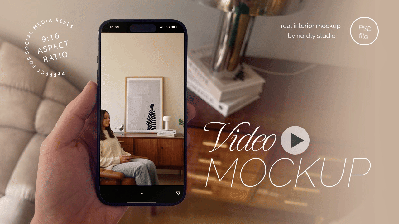 Video Frame Mockup With Person, DIN A Ratio, Thin Wood Frame, PSD Photoshop Animated Mockup, Vertical Frame Video Mockup Home Interior MOV