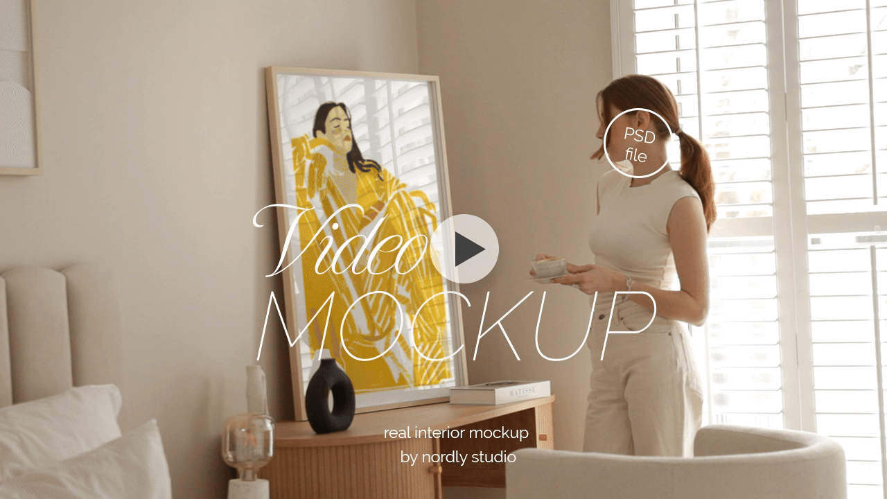 Video Frame Mockup With Person, DIN A Ratio, Thin Wood Frame, PSD Photoshop Animated Mockup, Vertical Frame Video Mockup Home Interior MOV